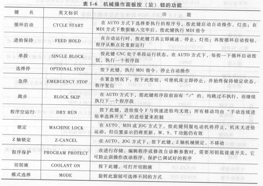 (1)機(jī)械操作面板  機(jī)床的類型不同,其機(jī)械操作面板上開關(guān)的功能及排列方式也有所差異。開關(guān)的形式有按鈕、旋鈕等。VP1050型立式加工中心的機(jī)械操作面板如圖1-26所示,電源通、斷按鈕設(shè)置在CRT/MDI面板上,而其他大多設(shè)置在機(jī)械操作面板上。操作按(旋)鈕的功能見表1—6。