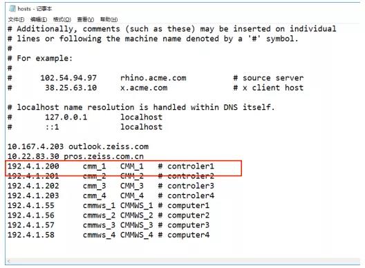 使用寫字板打開(kāi)hosts文件,檢查是否有192.4.1.200 cmm_1 CMM_1 # controler1。
