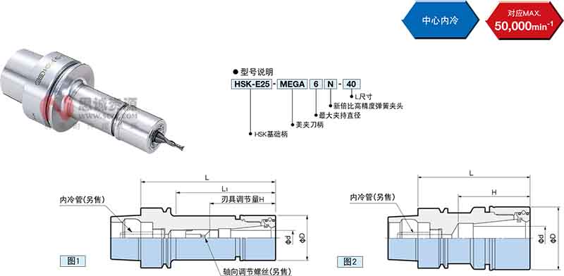 | HSK-E50-MEGA20N-75※▲ | 2 | 2.5 ~ 20 | 46 | 75 | - | 49 | NBC20-□ | 0.8 |