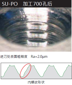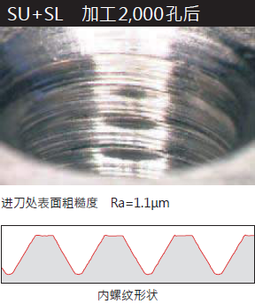 ●加工SUS304材時(shí),工具使用壽命是SU-PO的3倍以上,加工2000孔后,內(nèi)螺紋的完成表面平滑,形狀正確。