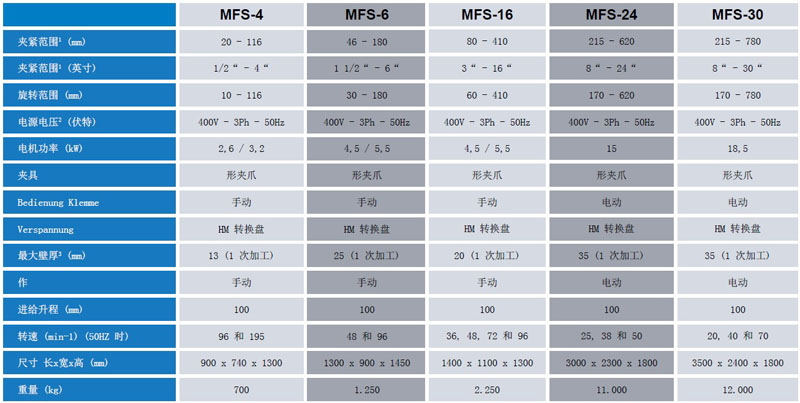管子端面銑削設(shè)備由 MFS-4 組成,管子夾緊范圍從1/2“ 至 4“ (20 mm - 116 mm 外徑)。型號(hào)名稱(chēng)內(nèi)數(shù)字指的是有關(guān)機(jī)器的最大夾緊范圍(單位:英寸)。MFS-16 例如有夾緊范圍最高16“ (410 mm)。
